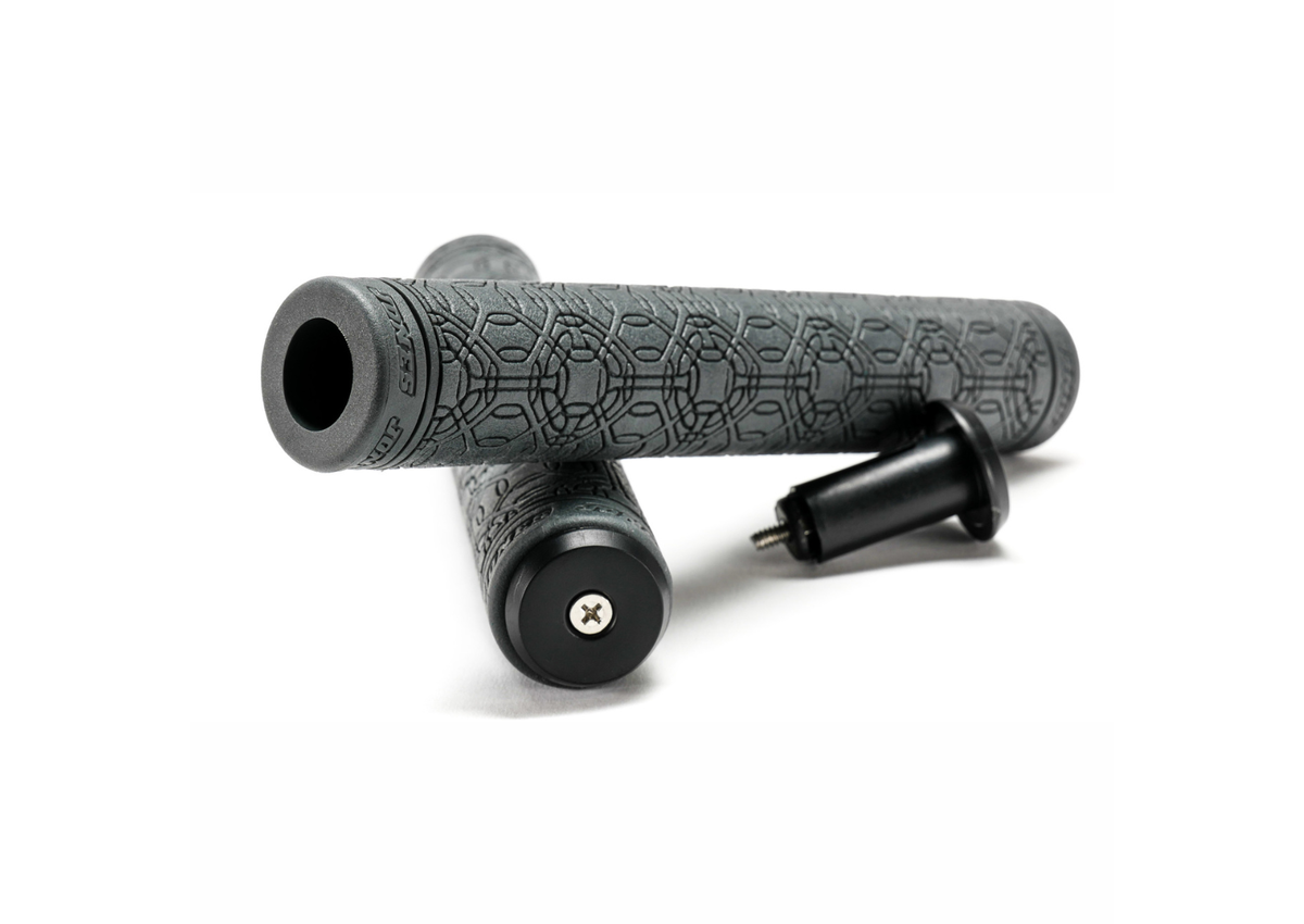 The ends of the grips are beveled to meet the angle of the bar plug, so that the plug can protect the end of the grip better, which is really important when you're laying the bike down on its side. The bar plugs themselves have a captured nut in the wedge so that when you loosen the bolt to remove the grips, the nut stays in place and the plug comes right out! And now both the nut and the bolt that threads into it are stainless steel to resist rust!