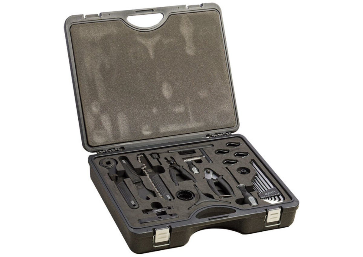 Designed to provide you with a better sports’ bicycle experience the PRO Advanced Toolbox is curated for the experienced and advanced home mechanic. The 25 tools slot, neatly, into a hard-shell plastic case, which boasts a protective foam inlay. The tools included in the Advanced Toolbox include a cassette removal set, chain tool, pedal wrench, cable cutter, tire levers, quick link tool, Torx Y-wrench, hex key set, chainring nut wrench, 4 spoke wrenches, a Phillips PH2 screwdriver and a Hollowetech II bottom bracket remover tool.