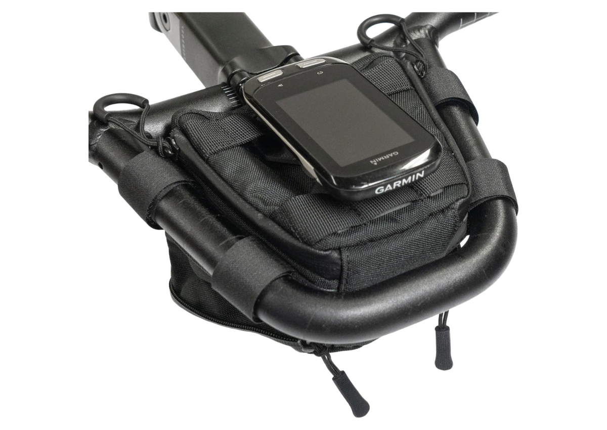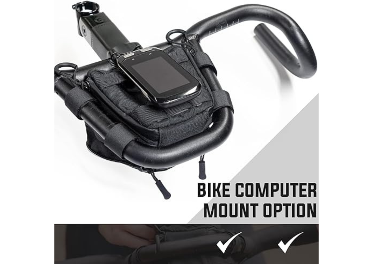 The optional bike computer mount is compatible with Garmin and Wahoo computers and allows you to securely mount your bike computer on top of the bag in an ideal location just in front of the stem. Since the bag is fully supported by the alloy loop of the handlebar, the mount is very stable.